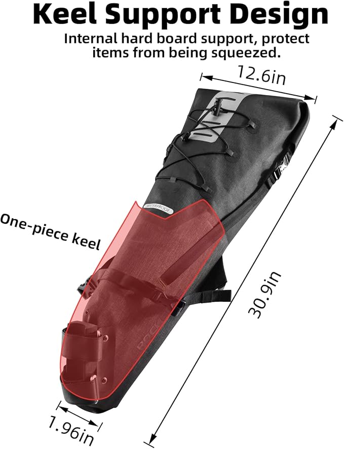 • ADJUSTABLE & FOLDABLE: Bikepacking bag maximum capacity 14L. Easy to hold your tools and short distance items. Roll-top closure design adjust the length of saddle bag to meet your different capacity needs.Why spend much money on several sizes of bag instead of this adjustable capacity saddle bag ?