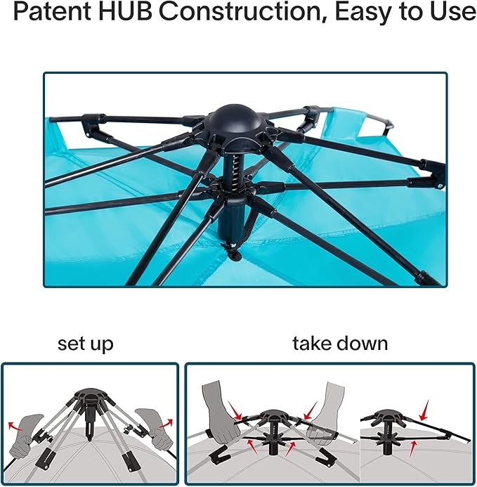 - ☀PATENTED AUTOMATIC OPEN sun shade beach tent on the Market : Patent pending HUB mechanic system on the top,which make tent open by itself effortless. Sturdy and rigid fibre glass frame supports the tent without worry of collapse.
