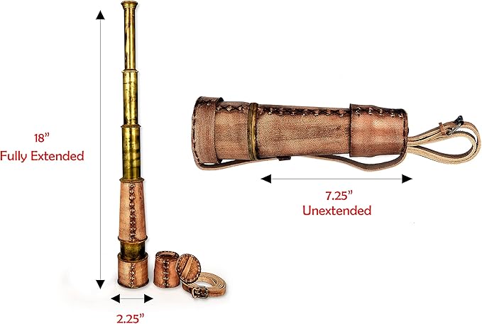 - DIMENSIONS AND DURABILITY: The telescope measures 18 inches when fully extended. 7.25 inches when un-extended, diameter is 2.25 inches. It is portable and easy to carry anywhere. This pirate spyglass is a long:lasting product as it is made of fine quality brass. Color may vary from the picture as it’s a handmade product.