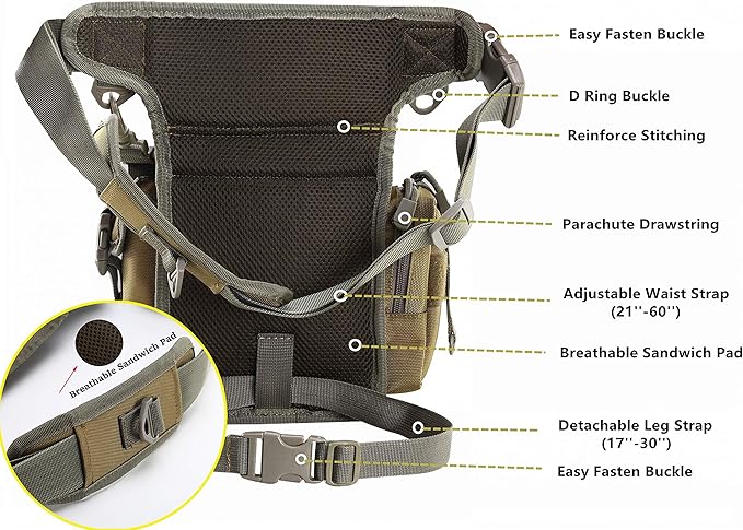 - ✅ EASY USE: Waist strap with 21’’-60” and detachable leg strap with 17’’-30” make it suit for different size people, and the buckles on the straps make this double leg drop bag easy to fasten and take off.