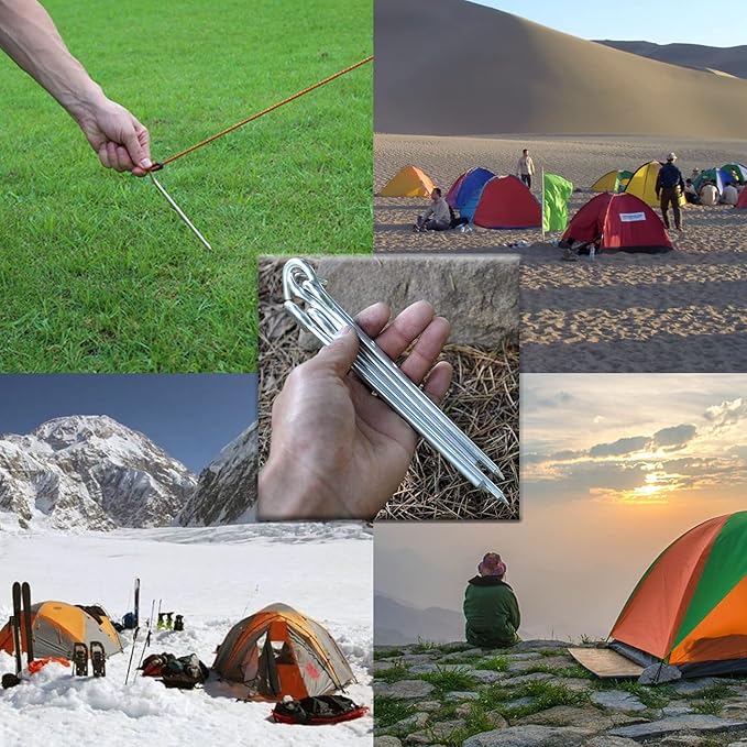 - 【Strong Holding Power】 These tent stakes aluminum will hold strong against heavy winds in dirt, sand, plants and rocky soil perfect for camping. Also can use in the beach sand but not the specialized canopies stakes for sand
