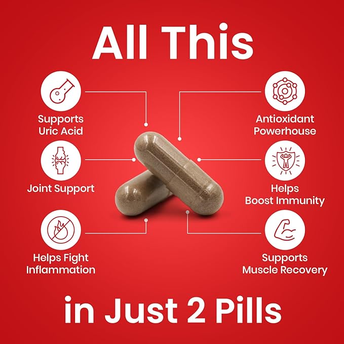 • Supports Uric Acid Management: Formulated to assist in uric acid metabolism, these tart cherry extract capsules help flush excess uric acid while promoting joint health and reducing discomfort caused by uric acid crystals.