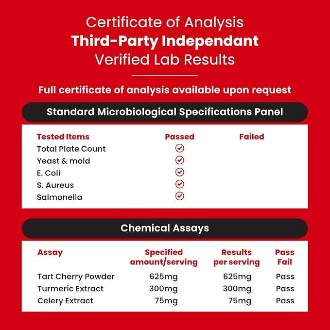• Third-Party Tested for Quality: Every batch of our tart cherry capsules undergoes rigorous third-party testing for purity, potency, and safety. Trust in a product designed to deliver maximum results with complete transparency.