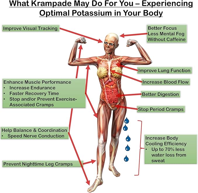 - Unlock Athletic Performance - Whether in your prime, or seemingly over the hill, replenishing potassium will increase blood flow more than 10x compared to low potassium muscles increasing endurance and speeding recovery.