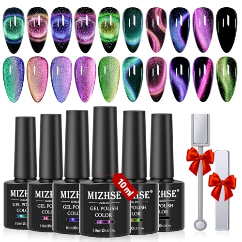- MIZHSE 9D Cat Eye Gel Nail Polish Kit: 5 x 10 ml magnetic gel polish collection set, 1 black gel polish, 2 magnetic sticks. Cure under nail dryer lamp. All in 1 kit, save your money and time to nail salon! Professional cat eye gel for infinite styles. Suitable for natural nails, UV gel nails, false nails, acrylic nails, etc. Please refer to our videos for more detailed operations. If there is any doubt in the operation, please feel free to contact us!