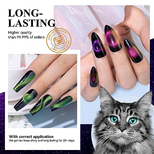 - Charming Effect of Cat Eye Gel Polish: Chameleon color with cat;s eye effect and holographic shimmer with galaxy effect. Tips: Mix Our magnetic nail polish gel color, and you will get amazing results! Attractive color shifting and cat eye effect will surprise you. Different effects depend on different lights and angles!