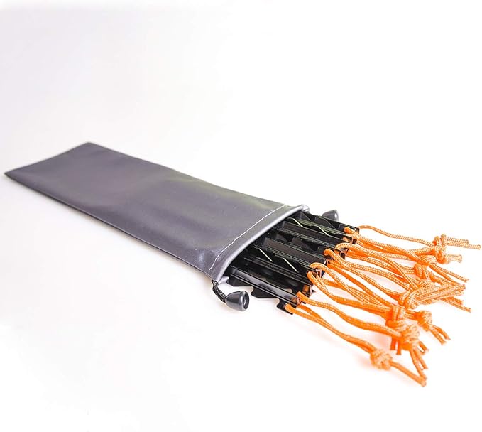 • Package Content: 12Pcs tent pegs with reflective pull cords + 1pcs carrying pouch;