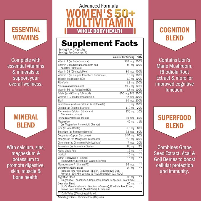 - Purity tested & allergen free: Each and every batch of BioSchwartz's Women’s 50+ Multivitamin capsules are third party tested to guarantee the highest purity, potency, and premium quality