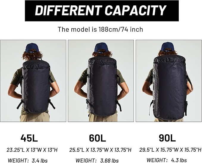 • Different Capacity ---- 45L: Airline carry-on size. Great size for a gym/fitness/sports bag or for shorter weekend trips. 60L: Designs for 5-7 days trips/camping/adventure. 90L:Designs for travel over a week/camping/adventure for more bulky sports gear