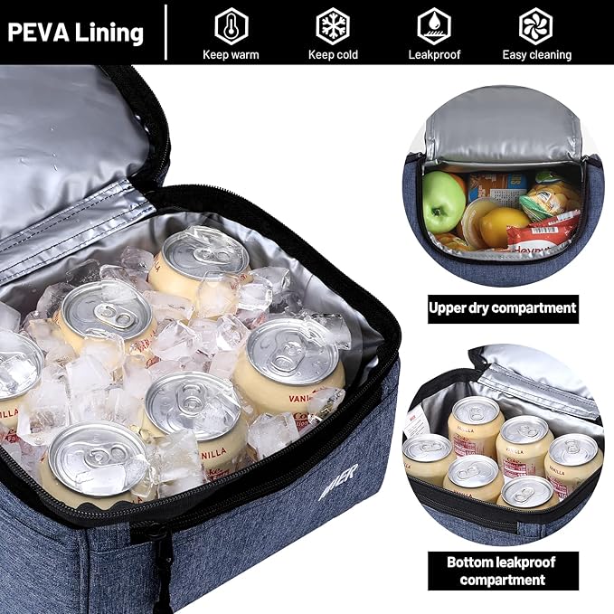 - 2 Compartment Lunch Bag ---- The top 'dry' section boasts a yawning U-opening and dual zipper pulls for automatic access, ideal for non-seeping items like fruits, snacks or pies. The bottom 'cold' section is no-leak insulated with soft PEVA liner, perfect for drinks, water, juice and suchlike. Easy to clean