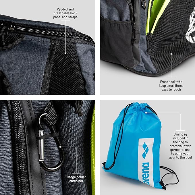 - Specifically designed for athletes and competitive swimmers, with a total of 45 liters (2746 cu in) of storage space so you can fit all your swimwear, workout clothes, training gear and accessories