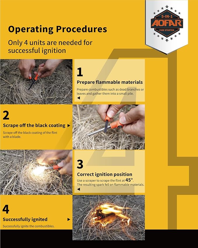 - MULTI-PURPOSE FLINT FIRE STEEL:3'Unique design scraper, 5'Rod,Match Survival Ropes,Compass,Emergency Whistle.