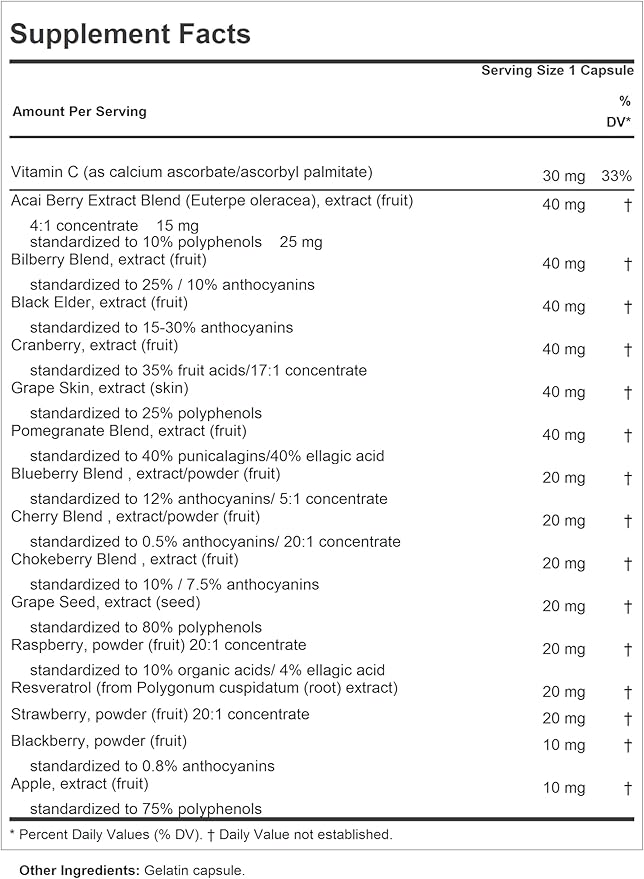 - Superior pure bio-active ingredients - combines 14 standardized extracts of the most well-researched fruits and berries: Bilberry, Cranberry, Grape seed, Grape skin, Apple, Pomegranate, Acai, Blackberry, Elderberry, Raspberry, Strawberry, Chokeberry, Blueberry, Resveratrol and Vitamin C. Contains no Milk / Dairy-Free, Gluten Free; no soy, yeast, wheat, sodium, salt, sugar, fat, cholesterol, color, preservative, common allergens or manufacturing additives.