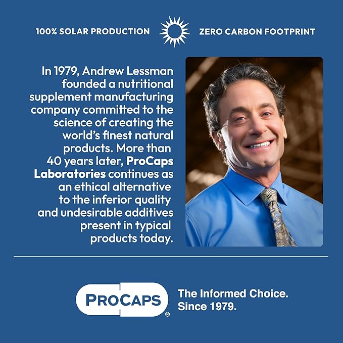 • Ethical & eco-friendly. zero carbon footprint - Uniquely committed to your health and the health of the planet, ProCaps’ facilities are 100% Solar Powered with a Zero Carbon Footprint and an LEED Gold green building status. All ProCaps bottles are made from 100% recyclable post-consumer resin. Plus, Andrew Lessman and ProCaps are the largest donor of prenatal vitamins in the world (over 2 billion capsules donated to date). ProCaps, the Informed Choice for Nutritional Supplements.