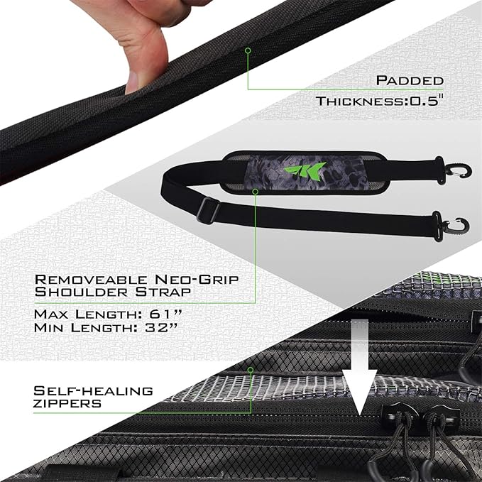 - FUNCTIONAL DESIGN - Designed for function and efficiency with the angler in mind, the molded tool holder ensures easy access to fishing pliers or other fishing tools without fumbling through your bag with a fish on the line. Our front pocket is designed to hold one 3600 tackle box tray for additional bait capacity. Double loop zipper pulls offer quick and easy one finger operation, and self-healing zippers ensure your bag won’t become useless by an accidental split zipper.