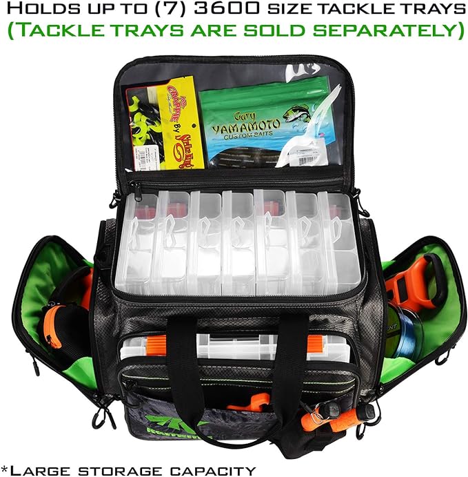 • COMFORT and STORAGE – The unique Neo-grip shoulder strap material grabs hold and won’t let go, the extra padding offers comfort for oversize loads. Unlike a hard fishing tackle box they are comfortable to carry. Best in class capacity! Load up your tackle trays with soft baits, fishing lures, crank baits, jigs, hooks, weights, terminal tackle and rigs. The Hoss can handle up to (7) 3600 tackle trays, (6) in the large main storage compartment and (1) in the front zippered pocket.