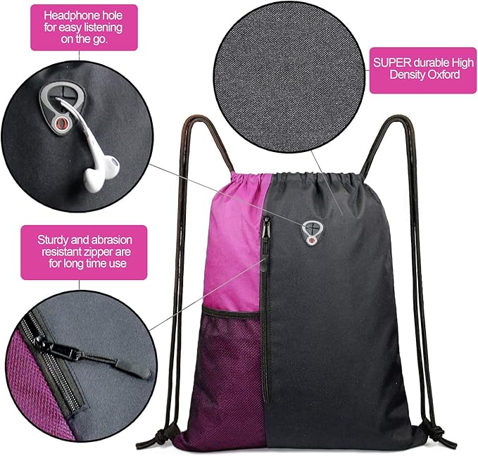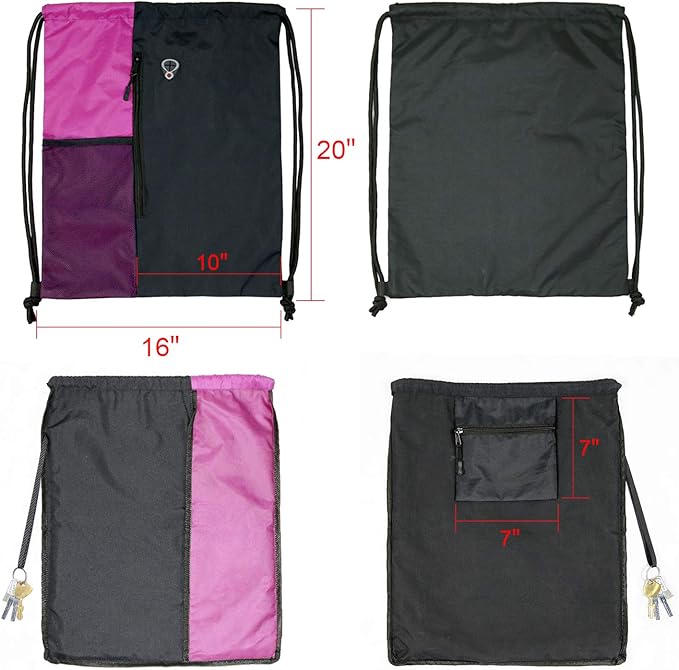 - CONVENIENT MULTI POCKETS: 20' tall full length and 10' width front large zipper pocket is perfect for keeping odds & ends handy without digging through the entire athletic bags. An extra inside zipper pocket measures 7 ' x 7', big enough for holding small valuables such as sports watch, wallet, cellphone to avoid any pickpockets. Another Side mesh pocket with elastic on the front of the string backpack can hold the water bottle, umbrella, sippers, and sunscreen.