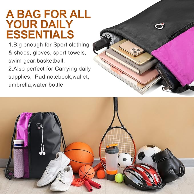 - LARGE SIZE: Our drawstring sports bag with large compartment measures 16' x 20' which is big enough for carrying a variety of items such as sports clothing & shoes, gloves, sports towels, swim gear, daily supplies.