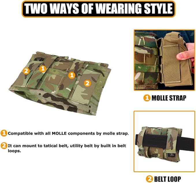 • Two different ways of wearing :1. It can mount to tatical belt, utility belt by built in belt loops. 2.compatible with all MOLLE components by molle strap .Note :If you you don't know how to use molle strap,please check the video we uploaded.