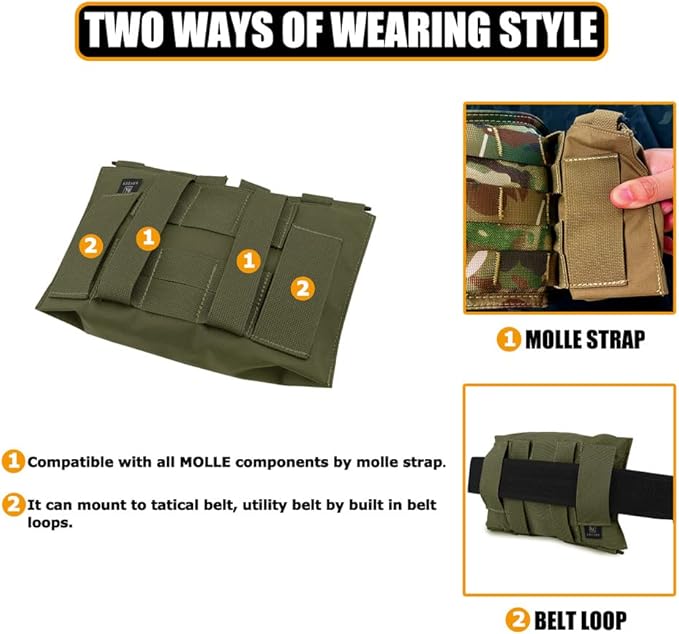 • Two different ways of wearing :1. It can mount to tatical belt, utility belt by built in belt loops. 2.compatible with all MOLLE components by molle strap .Note :If you you don't know how to use molle strap,please check the video we uploaded.