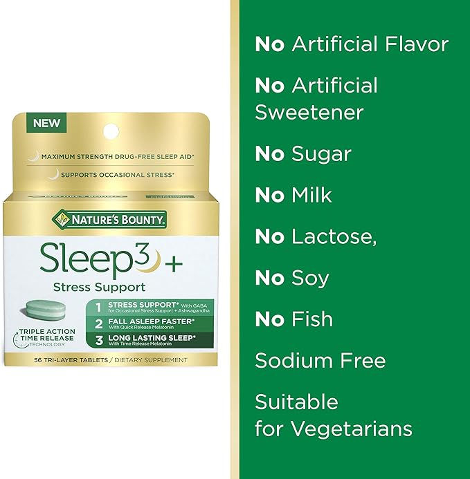 - 100% DRUG-FREE SLEEP AID: Nature’s Bounty Sleep3-plus Stress Support is the first and only maximum strength tri-layer, 100% drug-free sleep aid that supports occasional stress