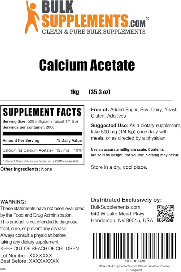 BulkSupplements.com Calcium Acetate Powder - Calcium Supplement, Calcium Powder - Food Grade, for Bone Health, 500mg (125mg Calcium) per Serving, 1kg (2.2 lbs)