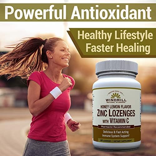 Windmill Health Products Natural Vitamins Zinc Lozenges with Vitamin C Honey Lemon Flavor, Immune System Support, Provides Antioxidant Support, Delicious & Fast Acting, 60 Lozenges, 60 Servings.