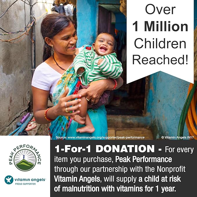 • Over 1 Million Customers + 1-for-1 Donation To Vitamin Angels. Peak Performance is celebrating over 1 Million customers and we are also very proud of our 1-for-1 donation match program. For every unit you purchase, through our partnership with the nonprofit Vitamin Angels, we will supply a child at risk of malnutrition with vitamins for 1 year! To date, we've supplied over 1 Million children with life changing Vitamins- So thank you for helping us continue this great cause!