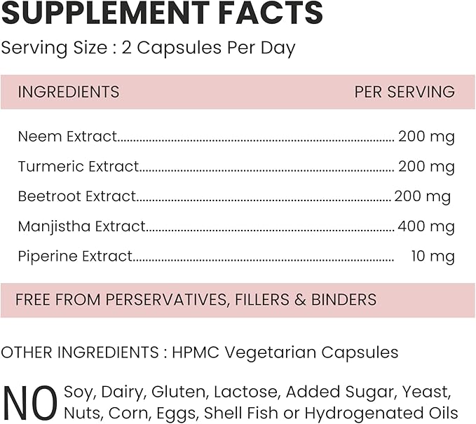 • Ingredients: Manjistha, Curcumin, Neem, Beetroot, Piperine