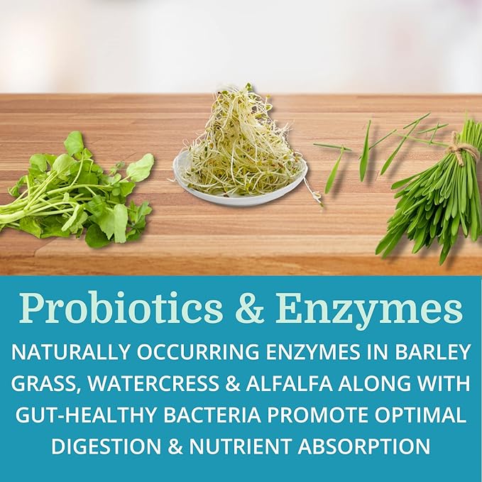 • Nutrient Absorption — Barley Grass & Alfalfa are superfoods rich in vitamins, minerals, amino acids, and digestive enzymes. Bile Salts & Pancreas Concentrate support the breakdown of proteins, fats and carbs.