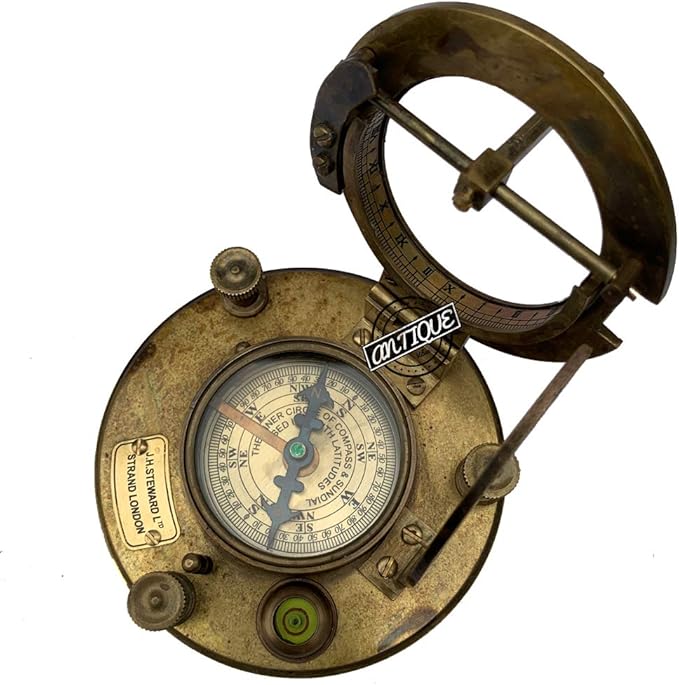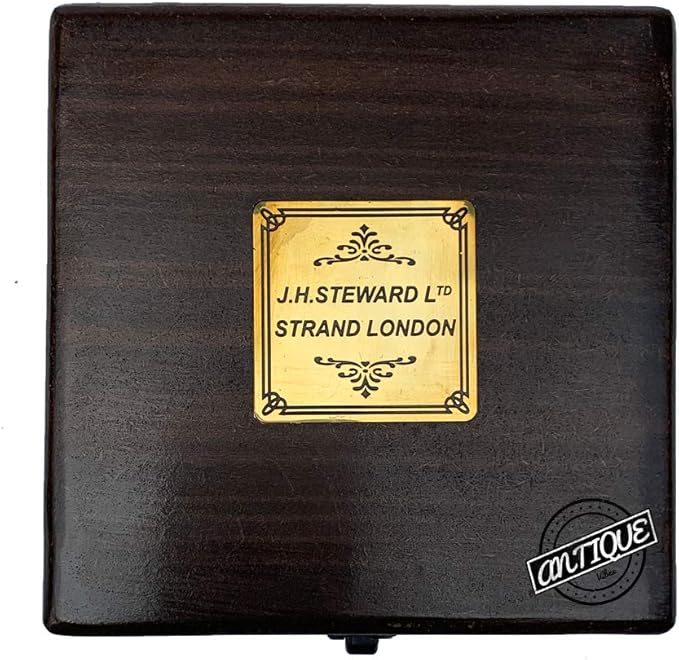• Compass Size: 10 cm 4' inches Box Dimension: 12 x 12 x 6 cm Material: Brass & Wood Finish: Antique brass Weight: 500 grams with box Type: Magnetic Sundial Compass