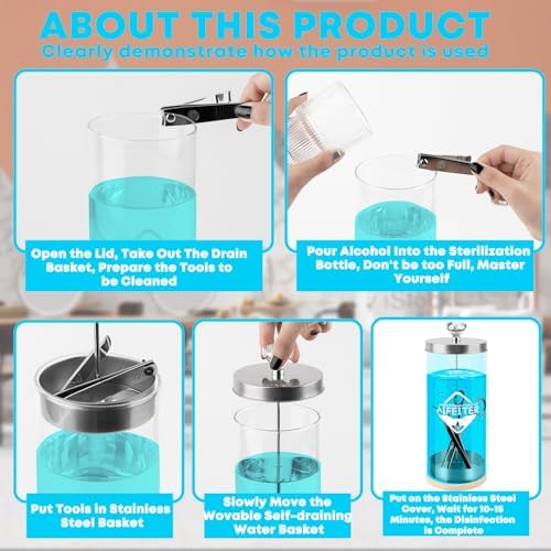 • Usage: The design of the disinfection tank is simple.Users only need to put the tool into the disinfectant,cover it,and complete the disinfection process.Keep hands away from any disinfectant solution.The lid is made of sturdy crystal material,making the knob more comfortable to grip
