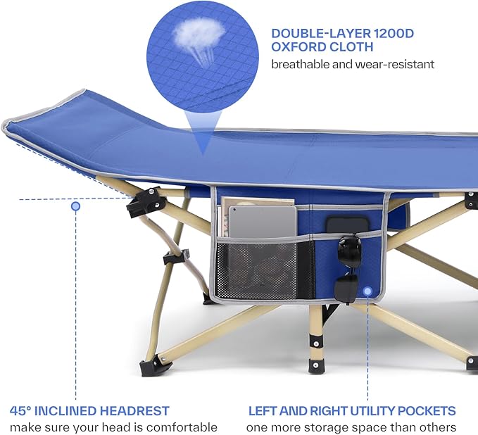 - Slim But Comfy: Just because it’s foldable doesn’t mean it can’t be comfortable! The Sportneer camping cots for adults, features a slightly tilted end made with polyester fiber so it’s comfy for sleeping even without a pillow.