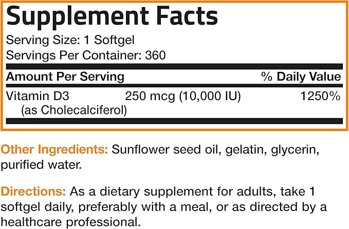 • Healthy Immune Support: Vitamin D3 10,000 IU softgels help to support a healthy immune system, strong bones, muscles, teeth, and more.* Our once daily D3 softgels are easy to swallow and help to replicate the benefits of the natural sunshine without sun exposure.