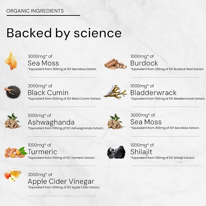 - SKIN, HORMONE & ANTI-AGING SUPPORT– Antioxidants and adaptogens like Sea Moss, Turmeric, and Shilajit help combat stress, support collagen, and promote radiant, youthful skin.