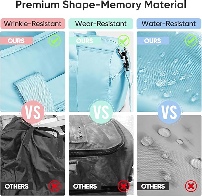 - [LIGHTWEIGHT & WATER PROOF DUFFLE BAG] Our duffle bags are made with 294T Twill Fabric. They are soft, washable, waterproof, wrinkle-free, and wear-resistant. Waterproof exterior keeps your clothes and items dry; it can be used both indoor and outdoor. Duffelbag with handles, and removable shoulder strap with adjustable buckle.