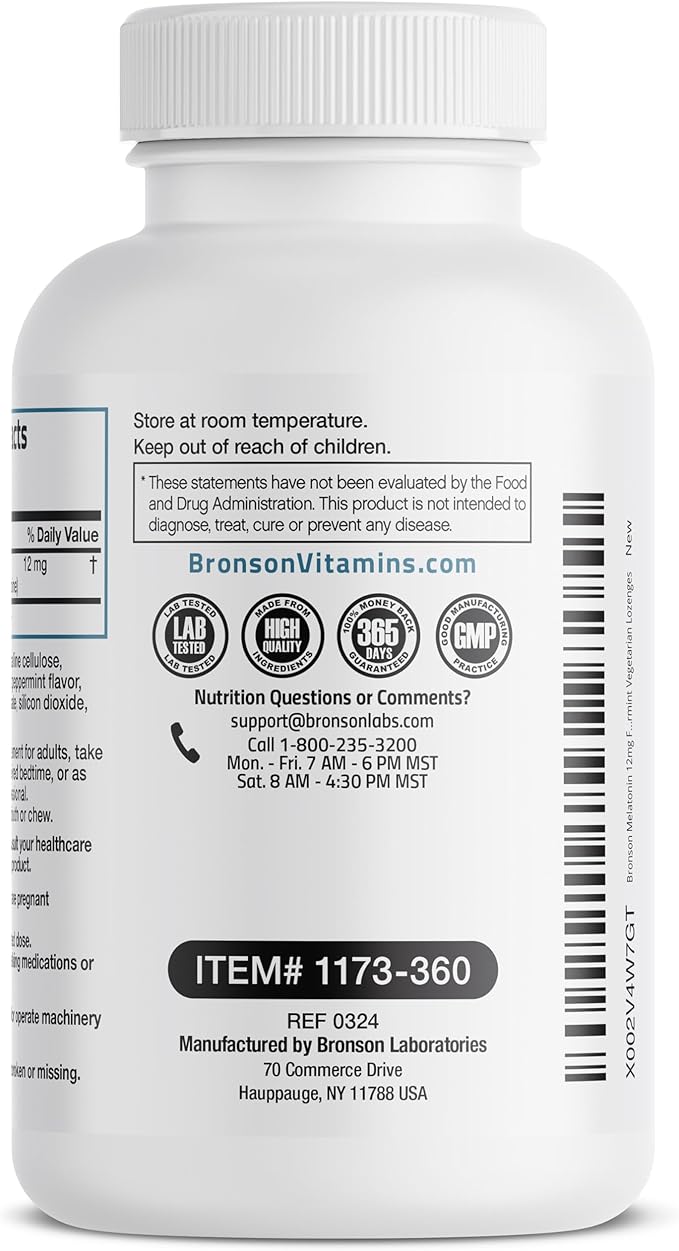 - High-Potency Formula: Providing a potent 12 MG per vegetarian lozenge of high-quality Melatonin to help support a healthy night of sleep.* Bronson’s great tasting peppermint formula provides fast support and can be taken at any time.