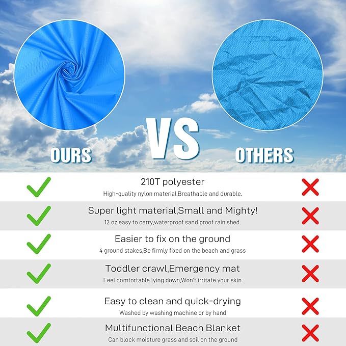 - 🏖️Beach Blanket Waterproof Sandproof:78''×81''size beach blanket,suit for 1-5 adults in total,odorless,made by parachute fabric.Rip-stop 210T polyester,light weight and small after folding.12 oz easy to carry,small and mighty!