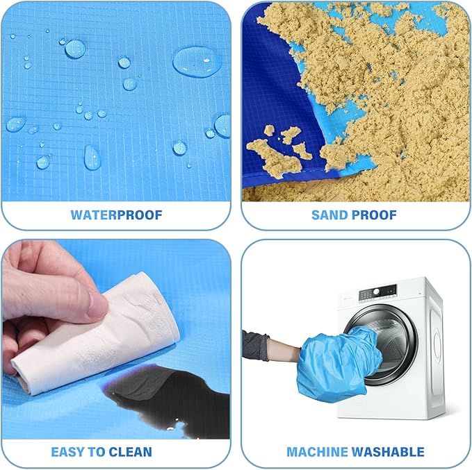 • 🏖️Beach Blanket Waterproof Sandproof:78''×81''size beach blanket,suit for 1-5 adults in total,odorless,made by parachute fabric.Rip-stop 210T polyester,light weight and small after folding.12 oz easy to carry,small and mighty!