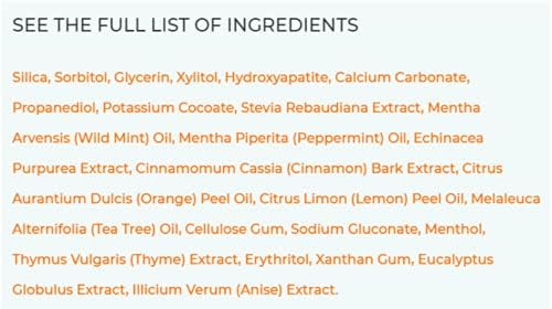 - Ingredients: Silica, Sorbitol, Glycerin, Xylitol, Hydroxyapatite, Calcium Carbonate, Propanediol, Vanilla Planifolia Fruit Extract, Potassium Cocoate, Stevia Rebaudiana Extract, Erythritol, Echinacea Purpurea Extract, Cellulose Gum, Gluconate, Xanthan Gum