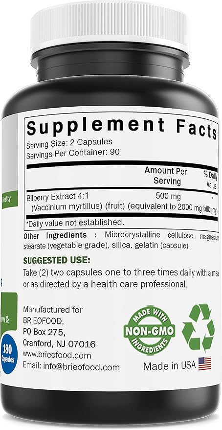 - HIGH POTENCY 2000MG BILBERRY - Each serving contain 2000 mg of Bilberry - 180 Capsules -90 Servings per container.