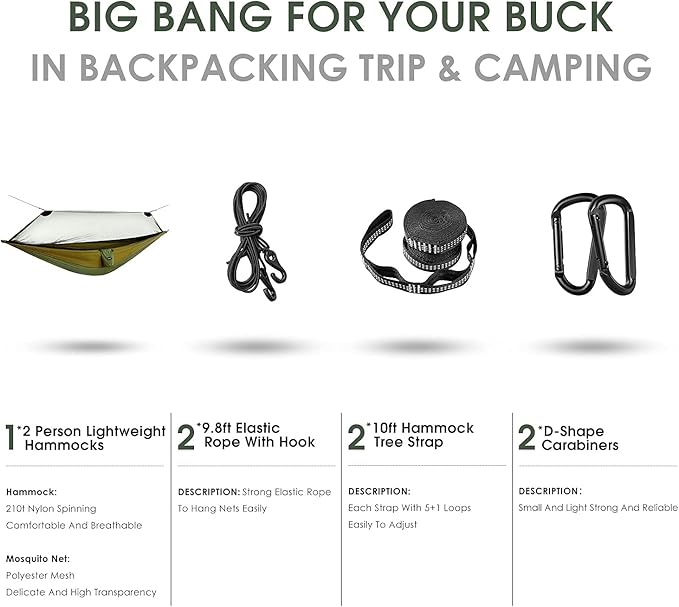 - Mosquitoes/Bugs Net Hammock: keep out the mosquitoes, bugs, flying critters or other wild outside to protect you in the harsh environment. The built in bungee/shock cord keeps the net out of your face, the mesh material on the net doesn't impede the view at all which can see the starry night sky when you sleeping.