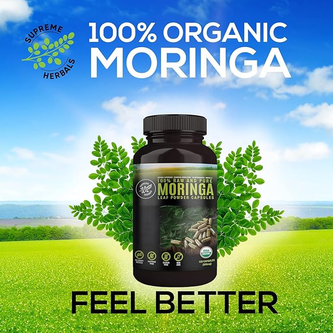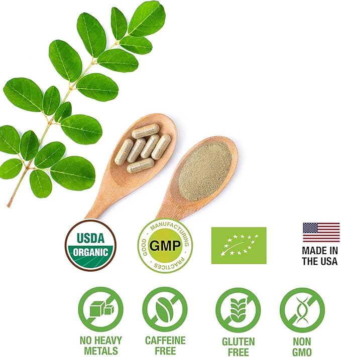 - OUR 100% RAW AND PURE MORINGA POWDER CAPSULES ARE CERTIFIED ORGANIC β Caffeine-free, Gluten-free, Non-GMO, and USDA Organic Certified with no heavy metals. You can trust the purity and quality of every capsule.