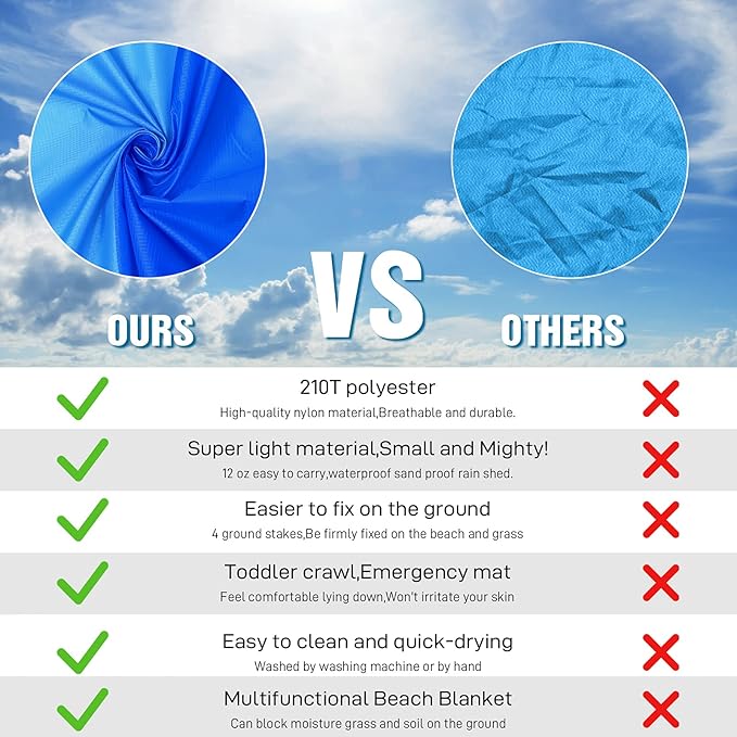 - 🏕️Beach Blanket Oversized:Good wear resistance,Dry-Quick,Can also be used as a rain shed,sunshade,tent,toddler crawl,Emergency mat,Feel comfortable lying down,Won't irritate your skin,Better professional fabric sewing.