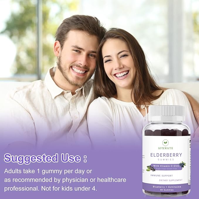 AFXMATE Sambucus Elderberry Gummies, Black Elderberry Gummy with Zinc and Vitamin C for Adults, Sugar Free Kids Multivitamin Gummies Immune Support* Supplement (2 Pack)