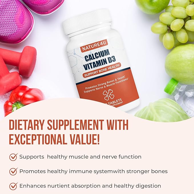 • Loaded with Health Benefits: Our vitamin D3 supplement enhances bone density, improves muscle strength and helps maintain healthy and strong teeth. The calcium tablets also help improve digestive health by boosting metabolism and support nerve functions for overall wellness.