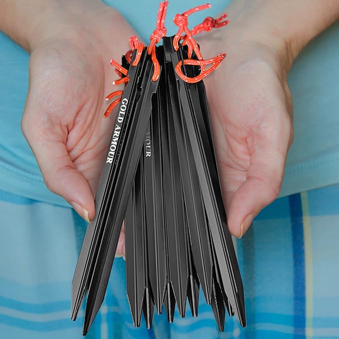 - ✔ HEAVY DUTY: The heavy-duty Gold Armour Tent Stakes are durable and made from premium 7075 grade aluminum