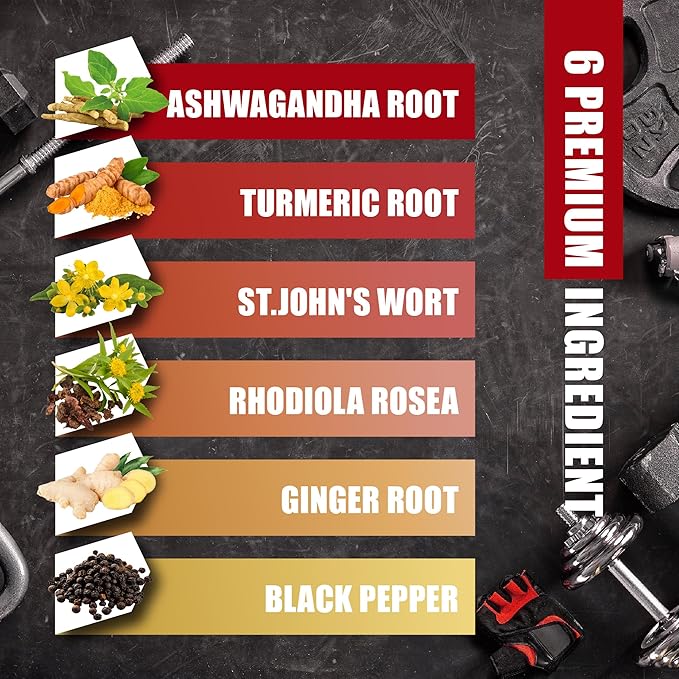 - Our Ashwagandha supplement contains 6 premium ingredients per capsule, including Ashwagandha Root, Turmeric Root, St.John's Wort, Rhodiola Rosea, Ginger Root, and Black Pepper.