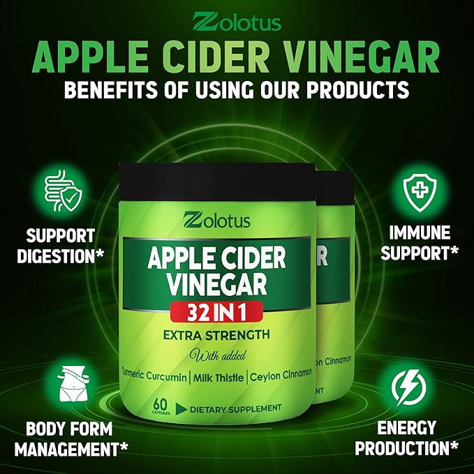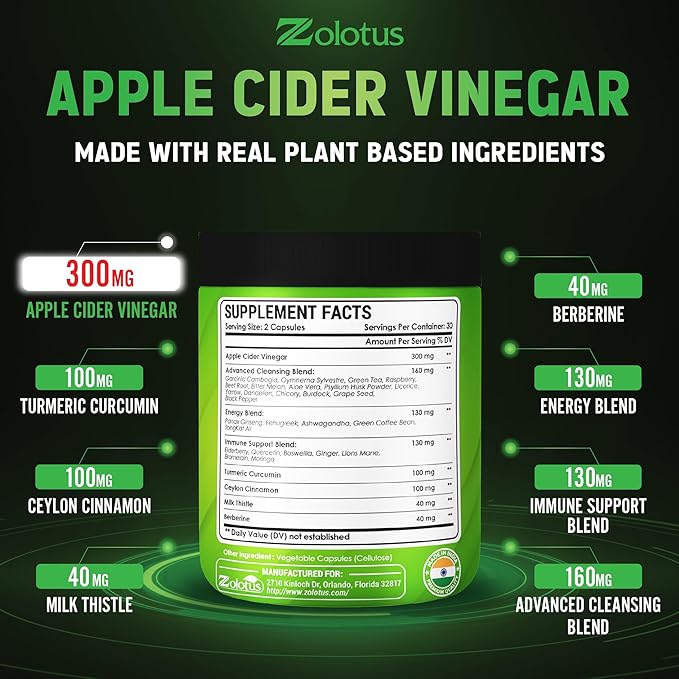 - Ingredients : Zolotus Apple Cinder Vinegar supplements Included Apple Cinder Vinegar, Ceylon Cinnamon, Milk Thistle, Turmeric, Berberine, Elderberry, and more.