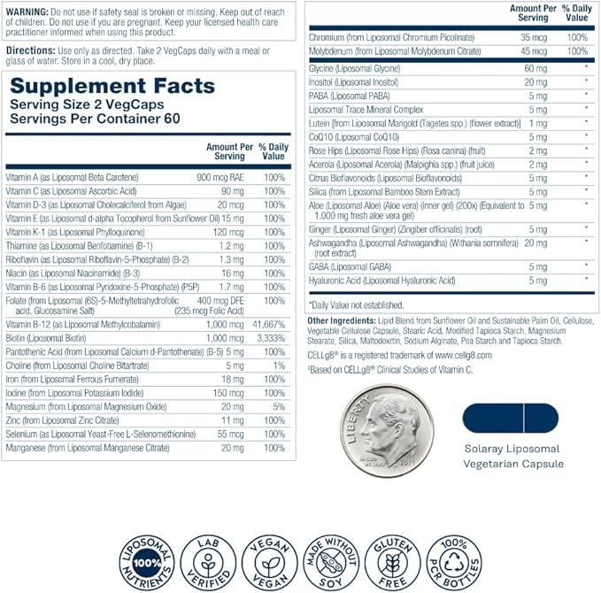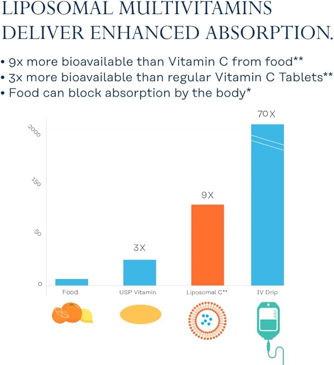 - Enhanced Absorption: Because most supplemental vitamins don’t survive stomach acid, our multi vitamin uses advanced liposomal technology to form a protective vehicle for nutrients. The liposomal vitamins and minerals are intended for delivery directly to cells in the optimal size for absorption.